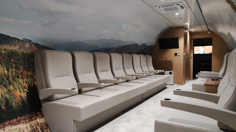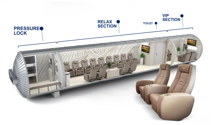 La esclusa de presión es una sala de transición ubicada en la entrada de la cámara. Esta es la sala que permite la compresión y la descompresión al entrar en la cámara principal. Después de ingresar a la esclusa de presión y completarse el proceso de compresión, entramos en la cámara principal donde podemos relajarnos. La cámara principal está dividida en dos secciones (sección de RELAX y sección VIP). Además, hay un baño completamente equipado en su interior.