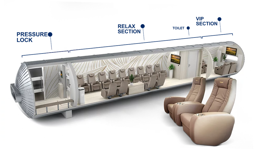 La esclusa de presión es una sala de transición ubicada en la entrada de la cámara. Esta es la sala que permite la compresión y la descompresión al entrar en la cámara principal. Después de ingresar a la esclusa de presión y completarse el proceso de compresión, entramos en la cámara principal donde podemos relajarnos. La cámara principal está dividida en dos secciones (sección de RELAX y sección VIP). Además, hay un baño completamente equipado en su interior.